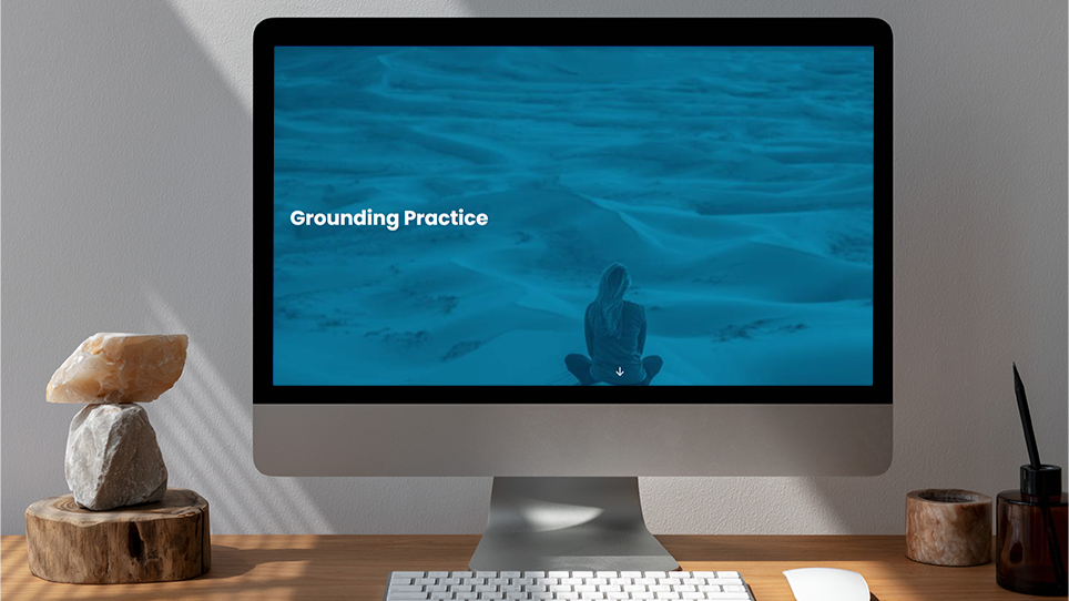 A wellness-focused microcourse teaching grounding techniques through the five senses, built in Rise 360 with imbedded Storyline interactions, featuring a Vyond explainer video and a Camtasia breathing exercise.