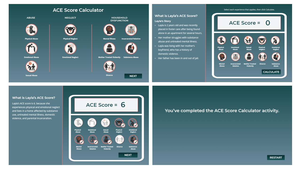 I designed this ACE Score Calculator to give healthcare professionals a hands-on, trauma-informed way to practice identifying adverse childhood experiences across multiple patient scenarios. The calculator walks learners through each ACE category step-by-step to help them identify their score and understand the impact of early experiences.