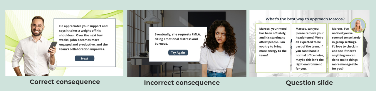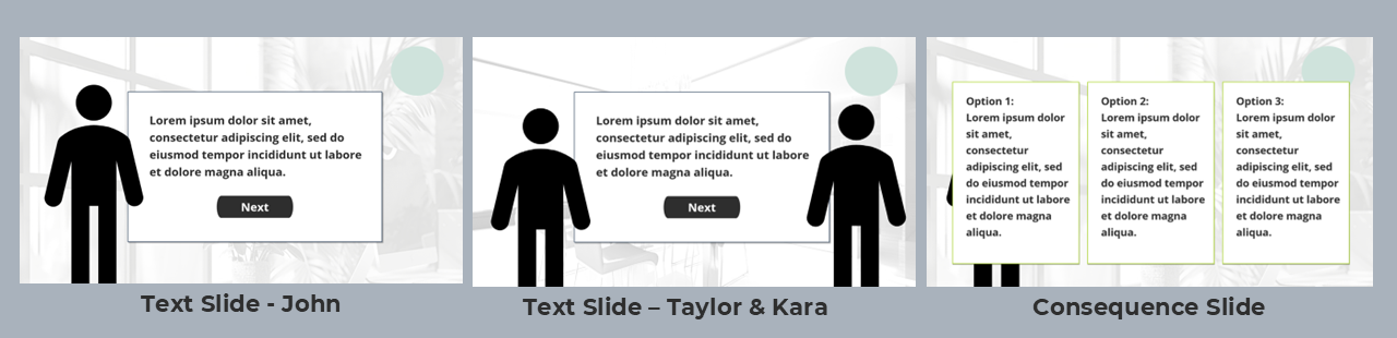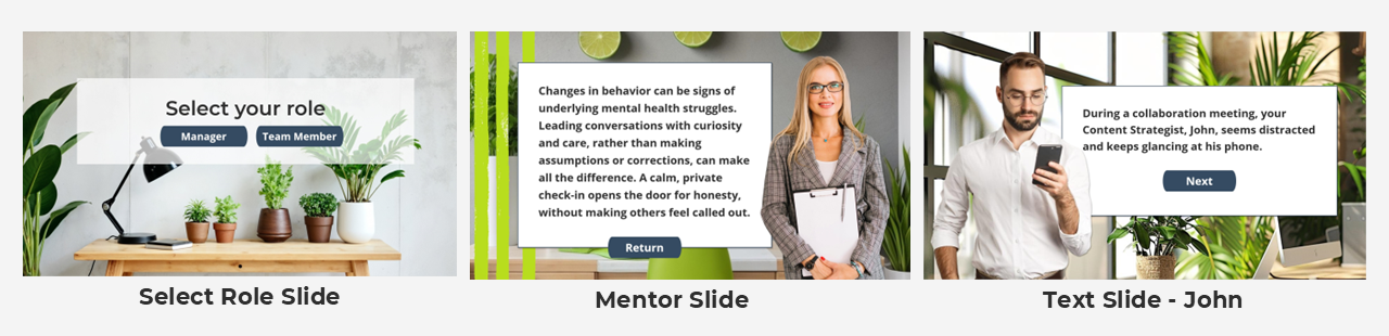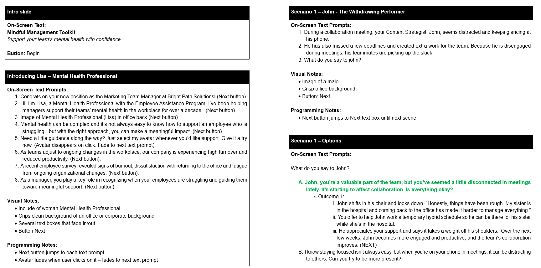 After mapping out key actions and outcomes, I developed a text-based storyboard that brings each scenario to life with realistic dialogue and meaningful choices. I created a cast of relatable characters, including a supportive mentor to guide the learner throughout the experience. Every scene was thoughtfully scripted to align with mental health best practices, and I outlined all screen text, interaction logic and visual direction to support the build in Articulate Storyline.