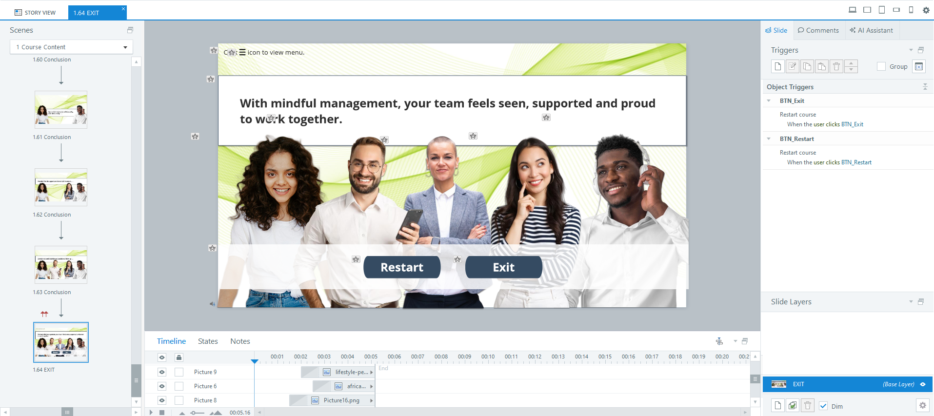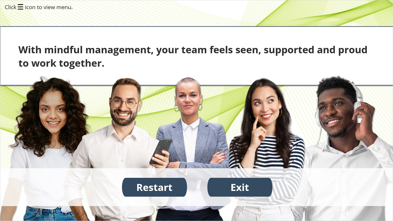After incorporating feedback from the prototype, I built out the full learning experience in Articulate Storyline 360. I prioritized an intuitive, emotionally supportive user experience by programming layered animations, hover states and dialogue-driven branching. Each scenario was carefully designed to reflect real-world workplace situations, with outcomes that adapt based on learner choices. I used variables and conditions to guide the learner journey and created distinct visual layers, highlighting mentor guidance scenes, to help reinforce key takeaways. For a few moments of delight, I added three different sound clips to the various feedback slides and the last slide. The last scene brings together all the characters to highlight the key takeaways that make mindful management when supporting employee’s mental health successful.