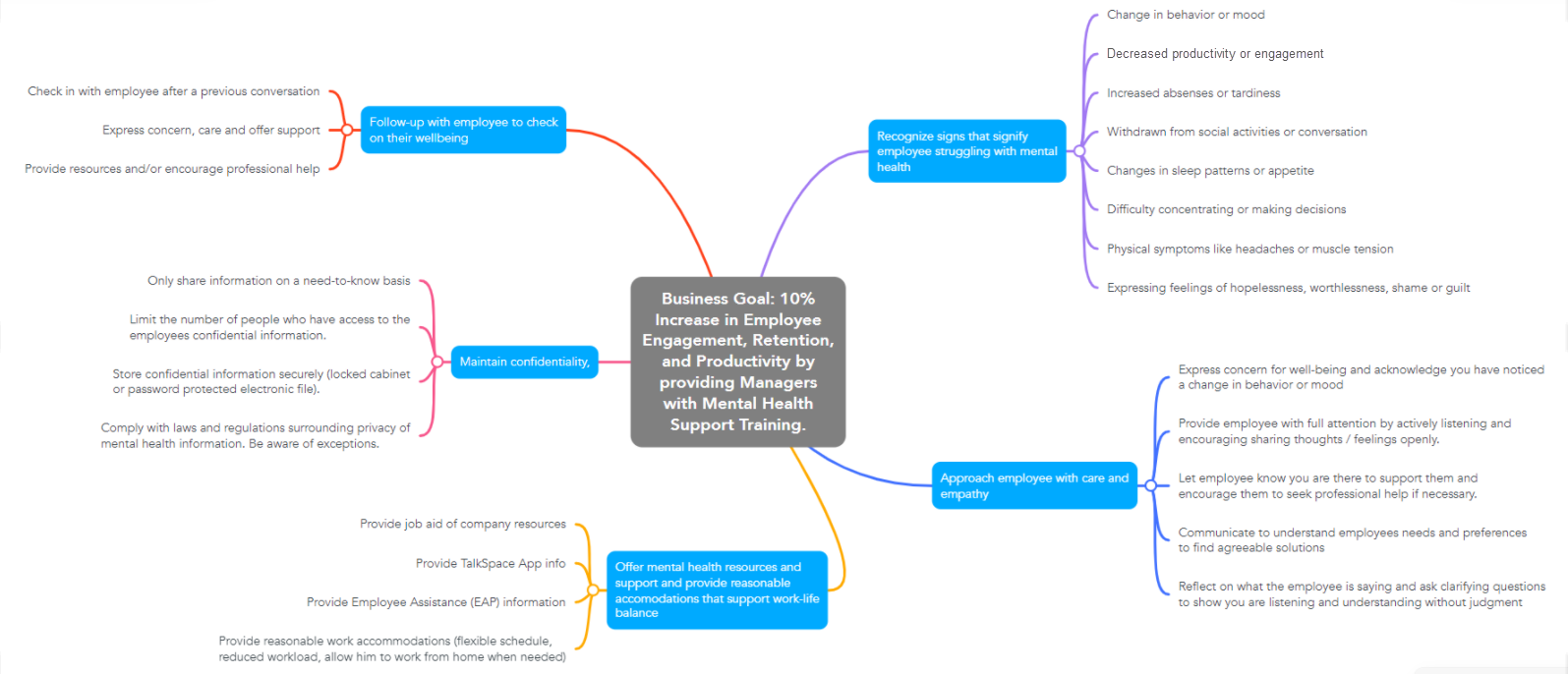 Although this is a concept project, its design aligns with the business goal outlined in the action map: a projected 10% increase in employee engagement, retention, and productivity when managers are equipped with mental-health-supportive leadership skills. These projections are based on outcomes typically associated with effective mental health training in the workplace.