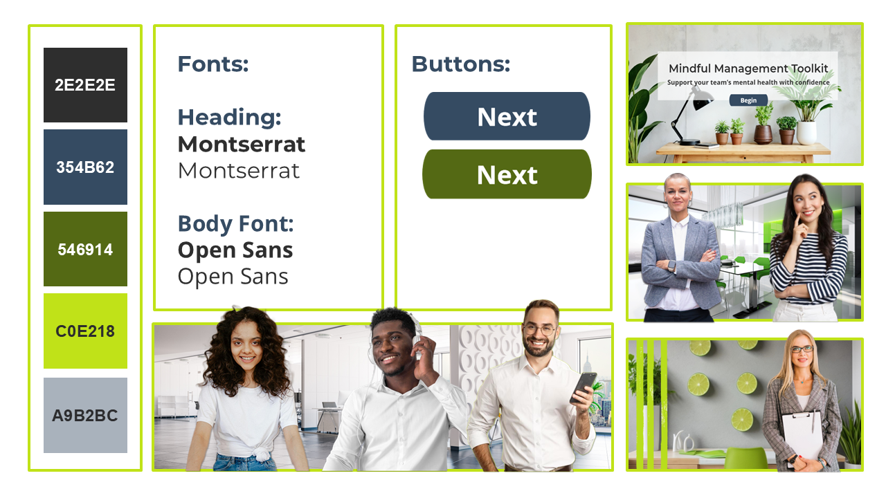 To bring the story to life visually, I designed a cohesive mood board and style guide with calming blues, greens and neutrals - punctuated with lime green for emphasis.